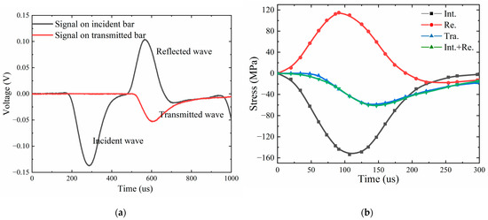 (a) Electrical signals captured from the strain gauges (specimen T-120-2); (b) dynamic stress equilibrium in specimen T-120-2.