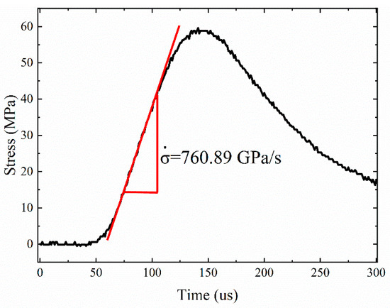 In dynamic tests, the strength of brittle materials is directly related to the loading rate [42]. Figure 5 describes a typical dynamic compression loading time–stress diagram, in which there is a region where the stress increases almost linearly with the increase of time, and the slope of this region can be defined as the loading rate [39]. In a rock dynamic test using SHPB, the pressure of the gas chamber when the striker bar is released is typically regulated to generate various loading rates; in this test, the relationship between the loading rate and the gas pressures of intact and pre-flawed samples is shown in Table 2.