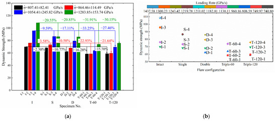 Table 3 shows the dynamic strength and strain of the intact and pre-flawed samples. Figure 7a illustrates the dynamic strength of the relationship between intact and each pre-flawed samples subjected to different loading rates. The numbers on the solid lines with different colors represent the percentage of strength reduction of each pre-flawed sample compared with the intact sample under the same loading rate range. The dynamic strength decreases as the flawed number increases. Pre-flaws with a trend parallel to the loading direction prominently weaken the dynamic strength. In addition, the strength of triple-flawed specimen with α= 60° is 3.21% lower on average than the specimens with α= 120°. Therefore, this indicates that the flaw number and flaw configuration have significant deterioration effects on dynamic strength.