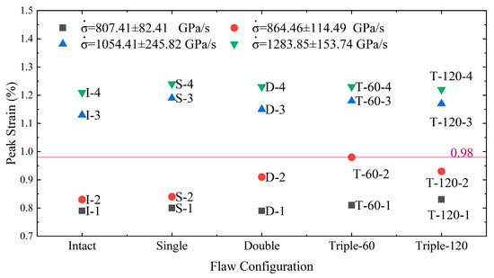 The peak strain is defined as the strain at the peak stress. The relationship between flaw number and peak strain is shown in Figure 8. Within the same loading rate range, the peak strain of the flawed specimens is generally larger than that of the intact specimens, it increases with the increase of the flaw number, and the peak strain of triple-flawed specimens with α = 60° is close to the specimens with α = 120°. This is because dynamic strain represents deformation capacity; with the increase in the number of flaws, the dynamic strength gradually decreases, the damage degree of the specimen is greater, the deformation capacity is greater, and the dynamic strain value increases. It indicates that dynamic deformation is significantly influenced by flaw number and that the influence of flaw configuration is limited. This is consistent with the conclusion when the trend of the pre-flaws is perpendicular to the loading direction [15]. Meanwhile, the peak strain increases with an increase in loading rate.
