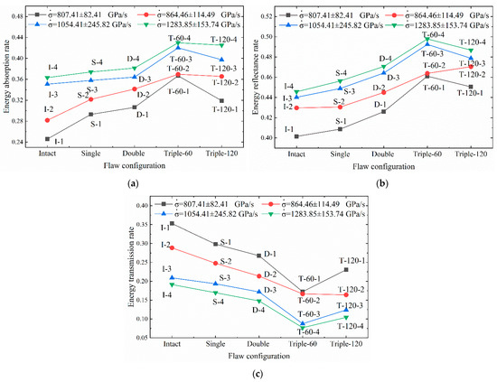 (a) Trend diagram of energy absorption rate with the intact and pre-flawed specimens; (b) trend diagram of energy reflectance rate with the intact and pre-flawed specimens; (c) trend diagram of energy transmittance rate with the intact and pre-flawed specimens.