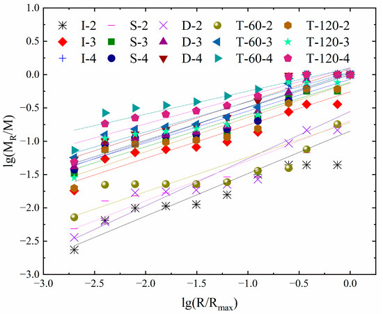 Figure 11 shows the lg(R/Rmax)~lg(MR/M) curves of sandstone fragmentation distribution. It can be seen that the fit line of the impact data scatter points of each group have a good correlation. Notably, five unbroken or slightly split specimens (No. I-1, No. S-1, No. D-1, No. T-60-1, and No. T-120-1) are excluded from the analysis. To further investigate the fragment characteristics, the fragment mass fractions and the corresponding mean fragment sizes are analyzed, as shown in Figure 12. It can be seen that under different loading rates, the fractal dimension shows an increasing variation trend with the increasing loading rate, and the mean fragmentation is contrasted to the fractal dimension.