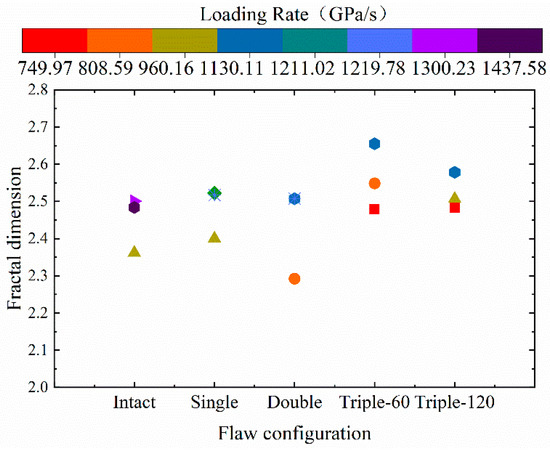 Figure 13 shows the relationship between the fractal dimension and loading rate of intact and flawed specimens. Subject to different loading rate ranges, the lowest fractal dimension is 2.29, which is a double-flawed specimen. The largest fractal dimension is 2.66, which is a triple-flawed specimen. This is because the failure mode of the double-flawed specimen is a shear failure; the initial cracks from the pre-flaw tips extend longitudinally, forming the main shear plane with large fragments; however, the tensile failure, the failure mode of other pre-flawed specimens, is formed by the cracks extending laterally, broken into small fragments. Therefore, the fracture degree of triple-flawed specimens with α = 60° is the largest, and the fractal dimension of the specimen increases with an increase in dynamic loading rate significantly, which is consistent with the variation of the dynamic strength. It can be seen that the increase in loading rate has a great influence on the fracture degree of the specimens, especially on triple-flawed specimens with α = 60°.