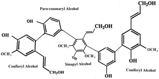 Lignin is the third polymer that is widely distributed in nature (Figure 2). This polymer, which is found in plant cell walls, gives the cell wall of the plant a strong defense against any microbial invasion. The major three forms of phenyl propane units found in lignin are guaiacyl propanol also known as coniferyl alcohol, syringyl alcohols also known as sinapyl alcohol, and p-hydroxyphenyl propanol also known as coumaryl alcohol. Lignin is primarily viewed as the glue that binds the various parts of lignocellulosic biomass together, making it water-insoluble. It is extremely challenging to hydrolyze biomass using enzymatic or microbiological processes because of how tightly lignin is bound to the cellulose structure [18,30].