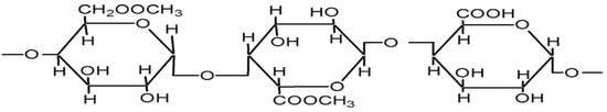 Only a limited amount of pectin can be found in plant cell walls. Pectins are heteropolysaccharides comprised of 1,4-linked units of α-D-galactosyluronic acid residues. Rhamnogalacturonan-I, homogalacturonan, and substituted galacturonans are the three main pectins that have been identified from plant cell walls [31]. The general structure of pectin is shown in Figure 3.