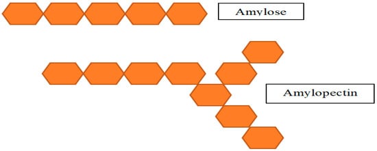 Glucose units in starch are connected by glycosidic linkages. Figure 4 shows the architecture of the two types of polymeric units that make it up: amylose and amylopectin. By α-1,4 glycosidic linkages, amylose is made up of linearly linked glucose units. Amylopectin is made up of linear glucose chains with an α-1,4 linkage that is joined to the side chains by α-1,6 linkage [32,33].