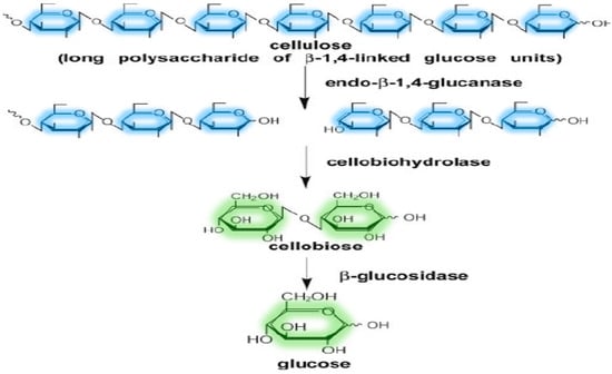 The majority of the time, lignocellulosic biomass requires a combination of numerous enzymes, the most crucial of which are cellulases. Cellulases are classified structurally as glycosyl hydrolases, which hydrolyze cellulose’s β-1,4-D-glucan connections to create cellobiose and glucose [75]. To completely dissolve the cellulose framework, three enzymes must act together as depicted in Figure 6 and the role of various enzymes is as follows: