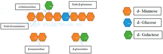 The following enzymes, whose modes of action are also shown in Figure 8, are considered to be involved in the hydrolysis of mannan and galactomannans by Moreira and Filho [81].