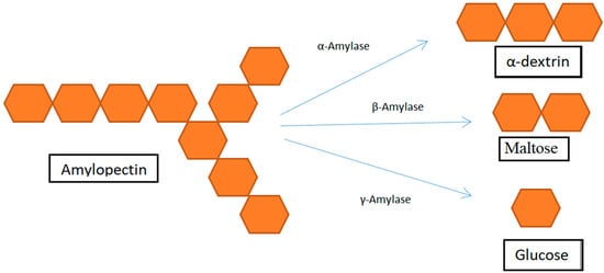 The three main categories of amylases, also known as glycosyl hydrolases (GH), according to the International Union of Biochemistry and Molecular Biology (UIBMB), are endo-amylases, exo-amylases, and debranching enzymes. Figure 9 shows how all of these enzymes work to break down starch. The various types of starch-degrading enzymes are as follows [101].