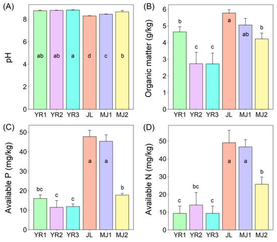Soil characteristics of six different sampling sites in the Yellow River wetland nature reserve in Luoyang city. Different lowercase letters denote significant differences between samples (p < 0.05). Error bars represent the standard deviation of the mean (n = 3). (A) soil pH, (B) soil organic matter contents, (C) soil available P contents, and (D) soil available N contents of six different sampling sites in the Yellow River wetland nature reserve in Luoyang City.