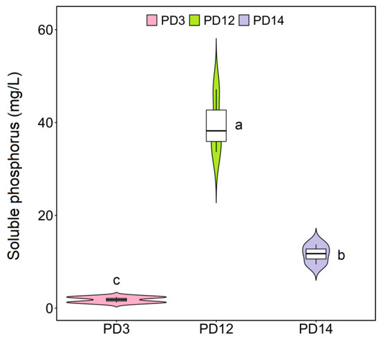 After incubation in NBRIP agar for 6 days, three strains (designated as PD3, PD12, and PD14) with clear P solubilization halo were isolated as the positive bacteria, and their ability to solubilize Ca3(PO4)2 was quantitatively analyzed in PVK medium. As shown in Figure 2, strain PD12 showed the most pronounced solubilization ability (39.68 mg/L; p < 0.05), followed by PD14 (11.67 mg/L) and PD3 (1.85 mg/L). Previous studies have found that there is a significant positive correlation between phosphate solubilization and PSB in soils [28]. Thus, our results suggested that PD12 had greater potential in increasing soil P availability and P concentration in plant tissues and might be a promising biological agent for improving soil fertility and promoting plant growth [29,30]. Furthermore, the growth promotion effects of PSB on plants was mainly to modify root functioning by modulation of the expression of auxin-responsive genes, thus playing a crucial role in regulation of plant hormone indole-acetic acid level with positive consequences on P acquisition and plant physiological status [31,32,33].