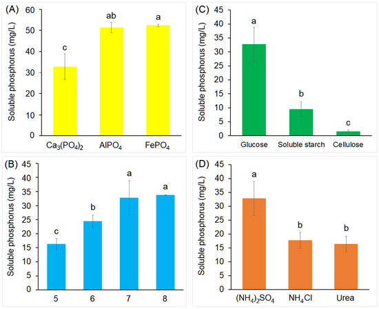 Effects of different factors on phosphate solubilization by strain PD12. (A) phosphate sources, (B) initial pH, (C) carbon sources, and (D) nitrogen sources. Different lowercase letters denote significant differences between samples (p < 0.05). Error bars represent standard deviation of the mean (n = 3).