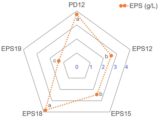 Moreover, five slimy colonies (designated as PD12, EPS12, EPS15, EPS18, and EPS19) were picked to further analyze the capacities of EPS production (Figure 4). The EPS yield of EPS18 (3.83 g/L) and PD12 (3.76 g/L) was significantly higher than that of others (p < 0.05), indicating that these strains could enhance soil cohesion, ensure moisture supply, and improve nutrients through EPS secreted and accumulated, which underlined the importance of EPS-producing bacteria for the improvement of soil quality and structure stabilization, and highlighting their potential as improvers of soil structure and fertility [4,5,6].