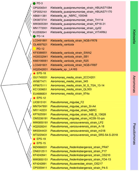 Moreover, physiological–biochemical characteristics (the methyl red test, Voges–Proskauer reaction, amylolysis test, gelatin liquefaction, catalase test, indole production, citrate utilization test, nitrate reduction test, acid production, and gas production) of PD3, PD12, PD14, EPS12, EPS15, EPS19, and EPS18 were identified (Table 1) and further compared with Bergey’s Manual of Systemic Bacteriology. As shown in Table 1, the results of the Voges–Proskauer reaction, amylolysis test, catalase test, citrate utilization test, nitrate reduction test, and gas production from glucose, as well as acid production from glucose, galactose, D-mannose, maltose, sucrose, and fructose of strains PD3, PD12, and PD14, were all positive. In contrast, the results of the methyl red test, gelatin liquefaction, and indole production of strains PD3, PD12, and PD14 were negative (Table 1). The results of the catalase test, nitrate reduction test, and acid production from glucose of strains EPS12, EPS15, and EPS19 were positive (Table 1). However, the results of methyl red test, Voges–Proskauer reaction, amylolysis test, gelatin liquefaction, indole production, citrate utilization test, and gas production from glucose, as well as acid production from galactose, D-mannose, maltose, sucrose, and fructose of strains EPS12, EPS15, and EPS19, were all negative (Table 1). In addition, various biochemical tests of strain EPS18 were performed and recorded as methyl red test—positive, Voges–Proskauer reaction—negative, amylolysis test—positive, gelatin liquefaction—positive, catalase test—positive, indole production—negative, citrate utilization test—negative, nitrate reduction test—positive, and acid production from glucose, galactose, D-mannose, maltose, sucrose, and fructose—positive, as well as gas production from glucose—negative (Table 1). Based on these biochemical characteristics, the strains PD3, PD12, and PD14 were homologous with Klebsiella spp., the strains EPS12, EPS15, and EPS19 were homologous with Pseudomonas spp., and strain EPS18 was homologous with Aeromonas sp.