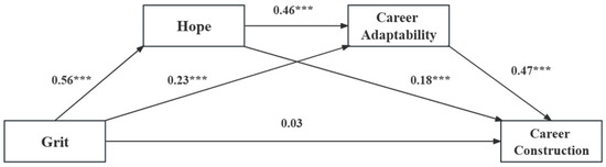 The other regression results are shown in Table 2. Grit significantly predicted hope (β = 0.56, p < 0.001) and career adaptability (β = 0.23, p < 0.001), but did not predict career construction (β = 0.03, p = 0.463); hope significantly predicted career adaptability (β = 0.46, p < 0.001) and career construction (β = 0.18, p < 0.001); and career adaptability significantly predicted career construction (β = 0.47, p < 0.001).