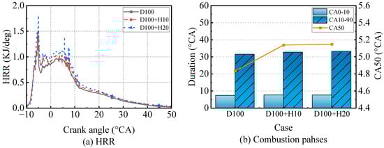 The in-cylinder pressure is an important parameter to deeply understand the combustion process and directly affects performance and emissions. The comparison of in-cylinder pressures is shown in Figure 4. In this section, D and H represent diesel and hydrogen, respectively. D100 means the diesel energy fraction is 100%, and H10 represents the hydrogen energy fraction at 10%. As shown in Figure 4, a larger leads to a higher in-cylinder pressure [42]. The corresponding CA position (PFP_CA) is delayed with the increasing , as shown in Table 3. The IMEP of D100 + H10 and D100 + H20 increased by 8.7 and 17.7%, respectively. The temperature contour is shown in Table 4. It is obvious that the temperature increases with the . This is because diesel has a dominant effect on combustion, while hydrogen only promotes combustion. The comparison of HRR and combustion phases is shown in Figure 5. The profiles of HRR and combustion phases are similar to each other. The phases are delayed with increasing , but the level is minor. This is because the overall energy of the additional hydrogen enrichment condition is higher than the original engine. Although the hydrogen enrichment could enhance the flame speed, the ratio is relatively small.