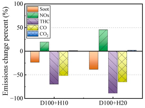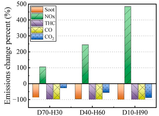 For the emissions, as shown in Figure 9, all pollutant emissions except NOx are reduced, especially THC and CO, which have become small in order of magnitude at >30%. It can be analyzed in two ways: first, the increased reduces the diesel fuel, resulting in lower carbon for THC and CO, i.e., the total fuel carbon content. Secondly, due to the higher combustion temperature of hydrogen enrichment, hydrogen increases the free radical content of the reaction, which promotes the combustion process and makes the combustion more adequate. For soot, when the is higher, it leads to more homogeneous fuel mixing due to the lower mixture density. In addition, the hydrogen raises the temperature of the compression process, resulting in a lower in-cylinder temperature gradient, which deteriorates the soot generation environment. The increase in combustion temperature provides a good environment for soot oxidation. The synergistic effect of the two leads to extremely low soot. For CO2, because hydrogen is a carbon-free fuel, CO2 emissions are dramatically reduced at higher [56].