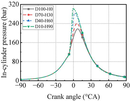 In order to investigate the effect of hydrogen substitution enrichment on combustion, performance, and emissions, the conditions with of 0, 30, 60, and 90% are selected for further simulation. In all the simulations, the total energy is kept the same, where D and H represent diesel and hydrogen, respectively. The D10-H90 means the diesel energy fraction is 10% and the hydrogen energy fraction is 90%. The in-cylinder pressure is shown in Figure 7. The comparison of PFP, corresponding CA, and IMEP is listed in Table 5. The PFP increases with the increase of . As the increases, the corresponding CA advances. This is because the higher burning velocity of hydrogen accelerates the flame speed and results in a higher PFP and an advanced CA. The IMEP of D10-H90 is lower than D40-H60, although the PFP is higher. However, too high a PFP is also not conducive to the modification of the original engine and even requires a redesign of the overall strength.