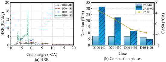 As shown in Table 6, the mean temperature is raised with the increase of . The high-temperature zone appears earlier as the increases. When the mixing ratio is 90%, the high-temperature zone appears inside the combustion chamber, while the high-temperature zone at other ratios is beyond the combustion chamber near the cylinder head. Therefore, increasing is beneficial to reduce the heat load on the cylinder head. The high temperature zone inside the cylinder is more uniform with the increase of . This is due to the fact that as the increases, the combustion mode gradually shifts from diffusion combustion to premixed combustion mode. This transition can be visualized from the HRR, as shown in Figure 8a. As the increases, the HRR gradually shows a dual trend. The first peak is caused by diesel igniting hydrogen, and the second peak is caused by the simultaneous ignition of hydrogen at multiple points of the combustion flame. When the is 60%, the two values are similar, while the peak of hydrogen combustion exotherm is much higher than that of diesel when the is 90%. It can also be seen from Table 6 that diffusion combustion generally starts from the tail, and the high temperature area is small. Because the laminar flame of hydrogen is faster, when premixed, the flame quickly spreads throughout the combustion chamber. Therefore, when the is higher, the second peak of heat release is also higher. The comparison of combustion phases is also shown in Figure 8b. Due to the faster burning rate of hydrogen and the shift in the combustion mode, the combustion phases are advanced. However, when the is 90%, the CA50 is already before the TDC, which is not conducive to power output.