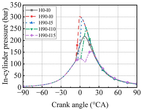 The “I” represents the relative injection timing, i.e., H0-I0 is the injection timing of the original engine in diesel mode (the relative injection timing is 0 °CA). The H90-I5 represents 90% hydrogen energy and 10% diesel energy, and the diesel injection timing is delayed by 5 °CA. Figure 10 shows the comparison of in-cylinder pressure at different injection timings. In all cases, the PFP is higher than the diesel mode. The pressure rise rate is also increased in dual-fuel mode. As listed in Table 7, the CA position of PFP decreases with the delayed injection timing. According to the above study, in dual-fuel mode, when at the maximum , the delayed injection timing facilitates an increase in engine power output. The IMEP exceeds the original diesel condition. When delayed by 10 °CA, IMEP improves by 3.4% compared with diesel mode and 2.4% compared with dual-fuel mode.