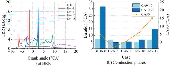 The contour of temperature distribution is illustrated in Table 8. The appearance of the high temperature zone is delayed with the delay in injection timing. The mean temperature in the dual-fuel mode is higher than the diesel model, which undoubtedly causes higher NOx emissions. The trend of peak temperature is the same as the injection timing. When the injection timing is early, two separate high-temperature zones appear at the beginning of combustion. This is due to lower temperatures and incomplete fuel atomization. Therefore, the fuel in the combustion chamber and near the injector ignited hydrogen gas separately. When in the dual-fuel mode, the diesel is already atomized and broken at the end of the injection compared with the pure-diesel mode. This is due to the reduced in-cylinder ambient density, which facilitates fuel atomization. The HRR and combustion phases are shown in Figure 11. The combustion center is advanced with the early injection timing. This is because as the injection timing is delayed, the in-cylinder pressure and temperature decrease, which delay the combustion phases [58]. As the injection timing is delayed, the second peak of heat release rises initially before decreasing. When the injection timing is delayed by 15 °CA, the second peak of heat release dissipates, resulting in a shift to premixed combustion.