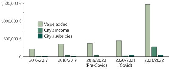 In addition to calculating the regional economic impact, it is necessary to evaluate the magnitude of this effect in comparison to the funding provided []. In the case of the Mannheim Philharmonic Orchestra, it can be shown that ongoing business operations, scholarships, and the expenditures of concertgoers generated a gross value added of EUR 1.473 million within the Mannheim city district in 2021/2022. This corresponds to 29 times the municipal subsidy of EUR 50,000 in 2021. Even during the COVID-19 crisis in 2020/2021, the gross value added in the city of Mannheim of EUR 449,000 substantially overrides the municipal subsidy of EUR 50,000 (see Figure 1).
