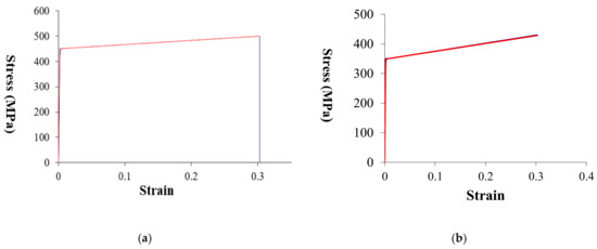 Stress–strain curve for nonlinear analysis: (a) stress–strain Curve for Lakhwiya and CommBank Stadium (C450L0); (b) stress–strain Curve for Optus Stadium (C350L0).