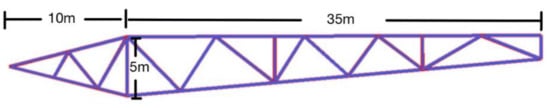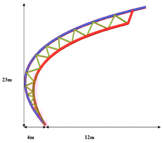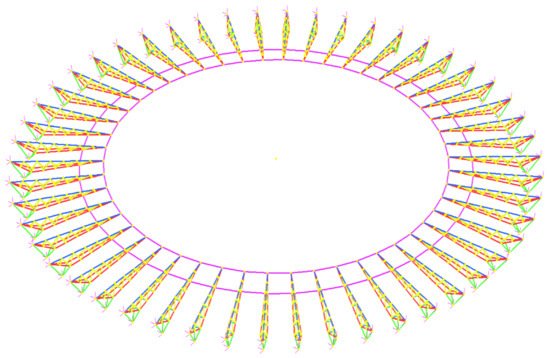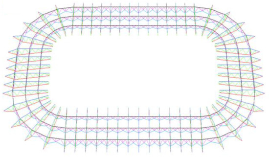 For Optus Stadium, the truss has a total length of 35 m, a maximum depth of 3 m, and a maximum width between bottom chords of 2.4 m [39,40,41]. The height from the top chord to the bottom of the truss is 6 m. The shape of the roof structure is a circle. The cylindrical coordinate is set up at the centre of the circular, which is 100 m away from the far end of the top chord. This bay of truss is then rotated by 7.2 degrees with a radius of 100 m fifty times to form the stadium’s roof structure. Two truss bays are connected by two straight structural elements (i.e., purple members) at the bottom chords. All nodal connections can transfer axial force, shear and bending moment.