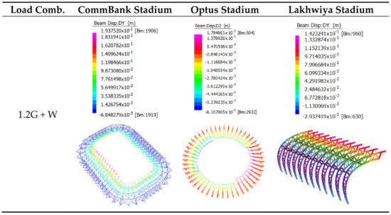 Table 3, Table 4, Table 5, Table 6, Table 7, Table 8, Table 9, Table 10, Table 11, Table 12, Table 13, Table 14, Table 15 and Table 16 record the results of the linear static analyses of different load combinations for further investigation on the section/member capacity for all three stadiums. Note that the G + 0.7Q combination of the serviceability limit state is not shown in the linear static analysis results due to its combination load factors being smaller than G + 0.7Q + W which means if the structure behavior under G + 0.7Q + W combinations is satisfying the criteria and requirements, it will satisfy in G + 0.7Q as well.