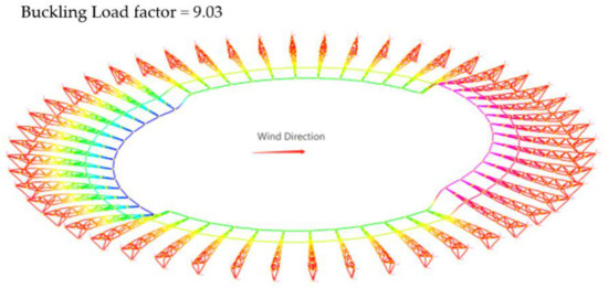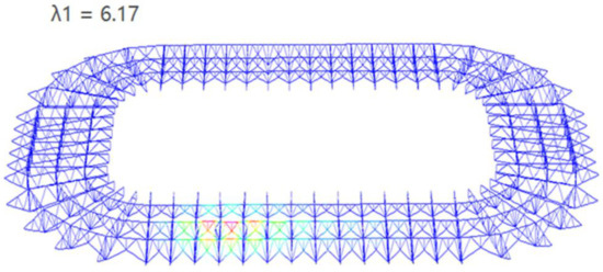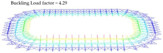 In terms of the linear static analysis, the self-weight of the structural member, live load, and wind load are calculated and input to Strand7. The five load combinations that are required to be checked as outlined in AS1170 [16] are analysed. Calculations of the critical axial tension, axial compression, bending moment, and combined actions are made; the comparison between the analysis result and the calculation shows that the design has sufficient strength. It was concluded that axial forces govern the design for the truss members which was within expectations as, theoretically, members would exclusively experience axial force [46]. In addition, the critical load case under linear static analysis involved wind loads. This is because stadiums often have long spans and increased heights, which will lead to increased wind velocities, which correlates to exponentially increasing wind loads [47,48]. Linear buckling analysis indicated that the critical loading factors were significantly lower for wind load cases. However, as the applied wind forces were higher than structural self-weight, dead, and live loads, the critical buckling load was also higher for the wind load. However, by examining the obtained nominal displacement of the structure, it was found that under wind loading, the structure may run into a minor deformation compared with other cases.