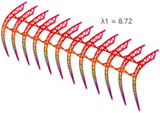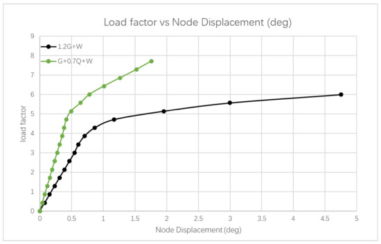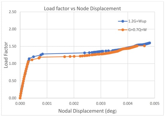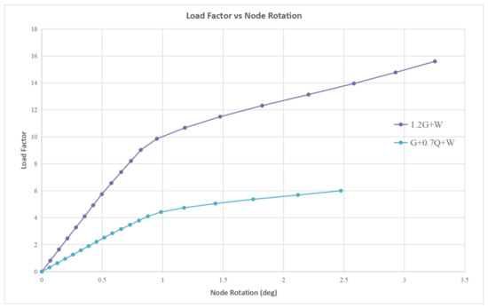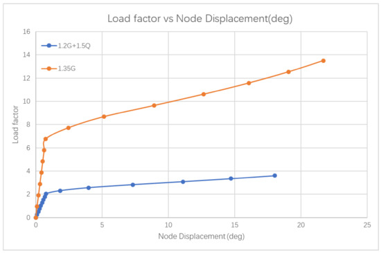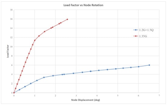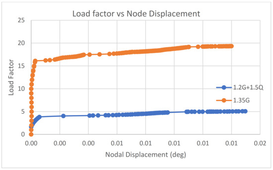 By observing the graphs presented in Figure 15, Figure 16, Figure 17, Figure 18, Figure 19 and Figure 20, the critical buckling load factor of the nonlinear analysis for each case can be obtained at the position where the gradient changes. The graphs exhibit a linear relationship between the load factor and the node displacement or node rotation in the beginning. The gradient of the line for each load case becomes gradual after reaching the critical buckling load. Either post-buckling collapse (i.e., the downward curve after the bifurcation point) or post-buckling (i.e., the secondary path) will occur when the load reaches the critical buckling load. If a post-buckling collapse happens, a snapback will occur in the load factor vs. the node displacement graph. The member’s strength will decrease quickly, and the displacement will increase significantly. In this model, the snapback is not observed in the above graphs, implying that the post-buckling collapse has not occurred. Alternatively, the graphs follow the secondary path after the bifurcation point. In this case, the member can still withstand the increased load, but the structure displacement will increase. When the structure starts to buckle, it will not immediately collapse. The significant deflection of the structural members can detect damage. Therefore, the design is considered ductile, and the structural failure will not cause a disaster in a short period.