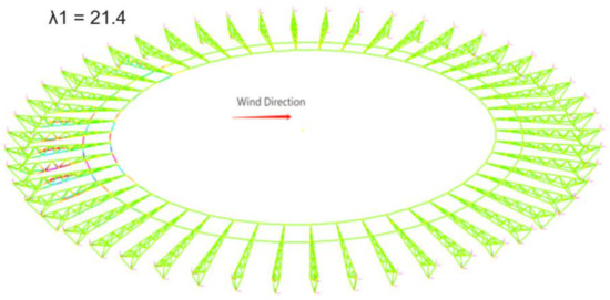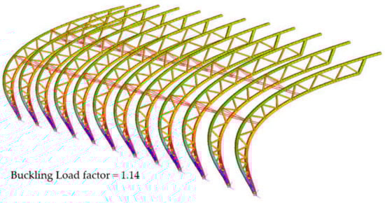 Nonlinear buckling analysis confirmed the theoretical framework of the overestimation of the critical buckling load factor by linear buckling analysis. Under non-linear buckling analysis, the critical buckling load was reduced by up to 90% for cases involving wind which indicated the presence of considerable geometric and material non-linearity of the structure [49]. In addition, the critical buckling load for the wind load cases approached closer to one, at which point the existing load combination applied on the structure would cause buckling to occur. However, after the bifurcation point is reached, the structure will not experience post-buckling collapse [50,51]. Instead, the structure will follow the secondary post-buckling path and fail under serviceability conditions which is desirable as opposed to sudden collapse. Moreover, examining the vertical displacement of the roofing structure, linear analysis also underestimated the maximum displacements in comparison with the non-linear analysis by up to 20 times.