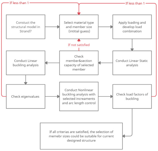 Below, Figure 21 displays a design flow that aims to provide a universal design procedure for stadium roofing structures using finite element analysis. The flowchart exhibits a universal design process whereby civil engineers can apply regardless of architectural design, material, and structure choice (truss or beam). The design process considers failure modes under elastic material properties through linear analysis and nonlinear properties such as geometric and material non-linearity through advanced analysis.