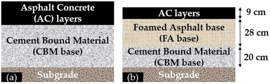(a) Initial pavement section and (b) rehabilitated pavement section.