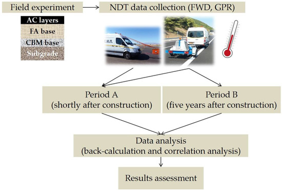 Outline of research methodology (AC: Asphalt Concrete, FA: Foamed Asphalt, CBM: Cement Bound Material, NDT: Non-Destructive Testing, FWD: Falling Weight Deflectometer, GPR: Ground Penetrating Radar).