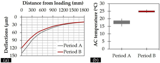 For the analysis purpose, atypical deflection basins with abrupt or abnormal shapes were excluded from further analysis. After that, 37 deflection basins were analyzed representing identical test locations for both test periods. In general, deflections from all the sensors were found to be lower in Period B than in Period A, although temperatures were higher during Period B. An average deflection basin per period is illustrated in Figure 4 together with the corresponding AC temperature range that was recorded. Although the Coefficient of Variation (CV %) of deflections per sensor was around 33–43% for both periods, the purpose of this figure is to roughly demonstrate that pavement condition of the whole length under investigation is in good structural condition as pavement deflections are kept at relatively low levels.
