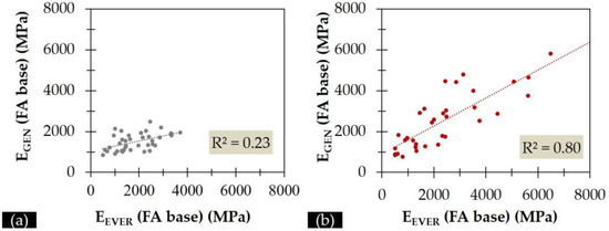 Figure 6 illustrates the correlation of estimated moduli from EVERCALC (EEVER) and GA tool (EGEN) for both investigatory periods. During Period A (Figure 6a), the achieved correlation based on linear regression is poor (R2 = 0.23), indicating inconsistencies between the two methodologies for FA modulus back-calculation. On the contrary, it seems that the correlation of EVERCALC and GA moduli is better (R2 = 0.80) during Period B (Figure 6b).