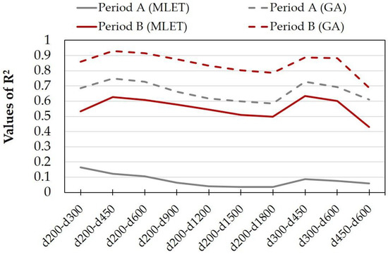 No significant correlation could be achieved with the EEVER for either of the investigation periods. In particular, during Period A, it was not possible to define a structural index for the assessment of the structural condition of the FA material, as R2 < 0.20 for all DBPs considered. During Period B, the maximum correlation with the EEVER was achieved for the deflection indexes d200 − d450 and d300 − d450, where R2 = 0.63, which cannot be considered as satisfactory. On the contrary, improved correlations were achieved through the GA, especially for the indicators d200 − d450 and d200 − d600. These improved correlations fall in the range R2 = 0.65–0.75 during Period A and in the range of R2 = 0.70–0.93 during Period B.