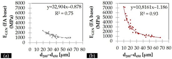 Considering the R2 values, the indicator d200 − d450 is selected for the estimation of FA moduli for both periods through GA. Similar remarks are available in the international literature too [34,35]. The selection of the indicator d200 − d450 as a more representative deflection indicator for the assessment of FA structural condition is further justified in this study, as the thickness of the FA layer is around 26–28cm, which nearly corresponds to this basin area. Correlations between EGEN and d200 − d450 are presented for the investigatory Periods A and B in Figure 8.