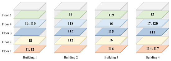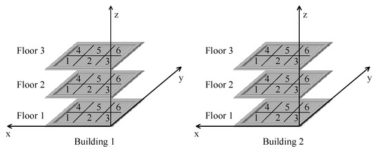 The first Objective Function (7) is to minimize the overall associated safety risk value, and the second Objective Function (8) is the maximization of the total rental profit. Constraint (9) guarantees that the sum of the enterprise area of each floor cannot exceed this monolayer area. Constraint (10) and (11) restrict each enterprise from being placed in one location. Constraint (12) guarantees that each enterprise can only be assigned to one building. To explain Constraint (13), a clear illustration is provided. All the enterprises are assumed to be in the same building. Thus, the enterprise association risk matrix (i.e., Equation (14)) can be obtained, where represents the associated safety risk caused by the influence of enterprise on enterprise . The symmetrical elements (i.e., and ) do not have to be equal.