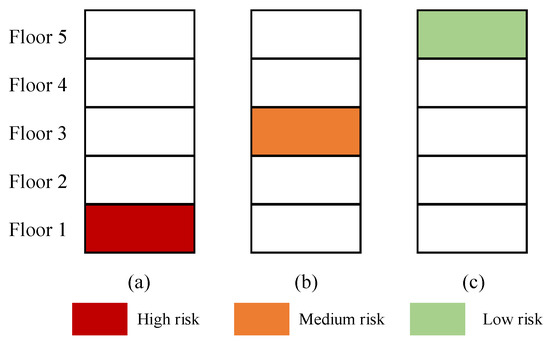 This study provides some visual examples to better illustrate the location safety risk. Enterprises with heavy equipment are almost impossible to collapse when they are located on the ground floor of a building; however, there is a risk of collapse when they are located at the top of the building. Enterprises with an explosion risk should be arranged on the top floor of the building, as the spread range and consequences caused by an explosion accident are more likely to be smaller than those on the bottom floor, as shown in Figure 2. In this study, the difference in the risk values of enterprises located on different floors is considered, that is, the location risk of enterprises is considered.