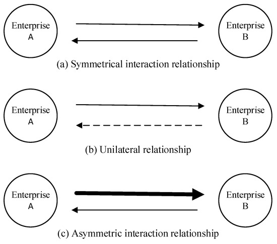 In general, as shown in Figure 3, the influence between enterprises can be roughly divided into three categories: (a) the symmetrical interaction relationship: Enterprises A and B have the same association safety risks; (b) the unilateral relationship: the impact of Enterprise B on Enterprise A is negligible; and (c) the asymmetric interaction relationship: Enterprises A and B have different association safety risks. There are often many enterprises in industrial parks, and the association safety risk among enterprises significantly influences the overall risk level of the park. The width of the arrows represents different degrees of influence.