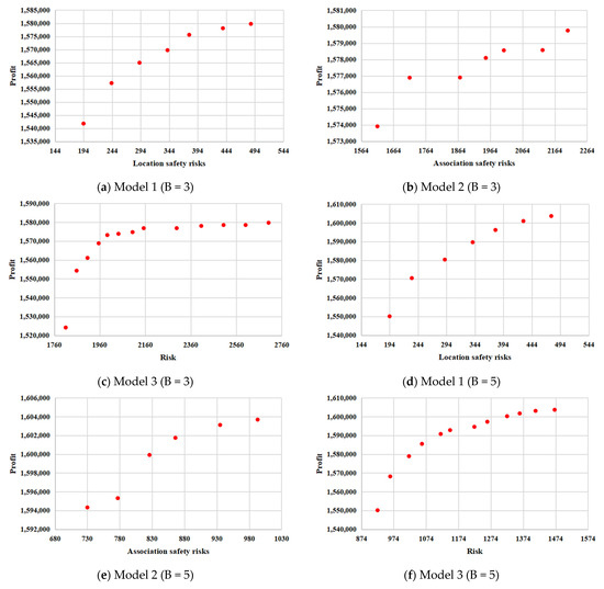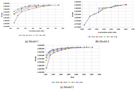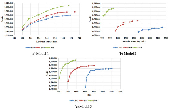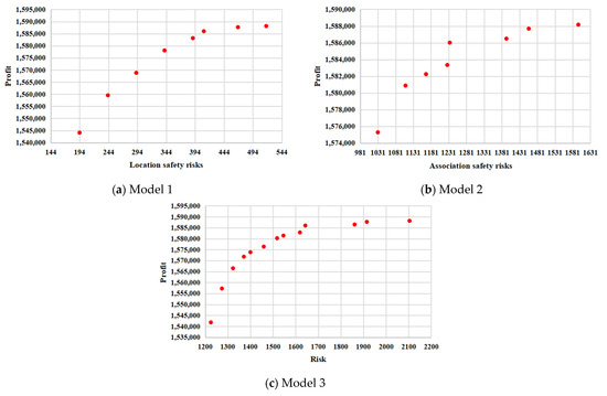 In the calculation process of Model 1, we observed an interesting phenomenon: the increased overall risk value is the lowest location safety risk of the additional enterprises. Therefore, for Model 1, the layout space is relatively affluent. Models 2 and 3 are sensitive to changes in the enterprise. This also indicates that an increase in the number of enterprises still dramatically impacts the total associated risk value in the case of sufficient layout space. Maximum rental profits do not show this phenomenon.