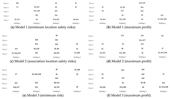 A comparison of Figure 5a and Figure 11 show that with a change in the location risk of Enterprise 1, the original layout of Enterprise 1 changes from the 5th floor to the 1st floor. In Model 3, Enterprise 5 was changed from the original layout from the 5th floor to the 1st floor (see Figure 5e and Figure 12). Moreover, the contribution of Enterprise 1 to the overall risk value of the park remains unchanged. It also shows that this model can optimize the layout of the enterprise according to the location safety risk to achieve the lowest overall risk value.