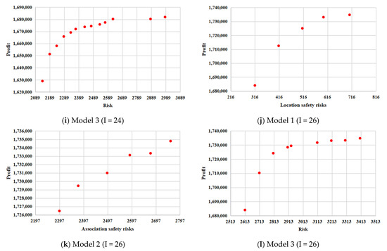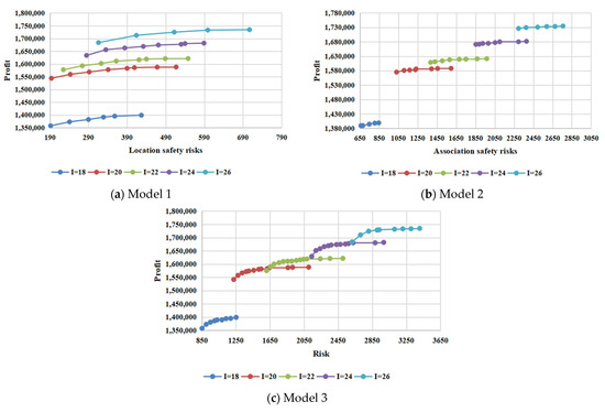 The number of enterprises is changed from 18 to 26, and the resulting risk value and rental profit are output. The Pareto frontiers for the three models are presented in Figure 9, and the variations of the Pareto frontiers with a different number of enterprises are shown in Figure 10. It is evident from the figures that as the number of enterprises increase, the minimum risk value and maximum rental profit increases. For example, when the number of enterprises increases from 18 to 26, the minimum risk value calculated using Model 2 increases from 661 to 2297; the maximum rental profit calculated using Model 2 increases from CNY 1,399,245 to CNY 1,734,798. This situation is easy to explain. The increase in the number of enterprises will lead to a more intensive distribution of enterprises, and the choice of space of each enterprise will be reduced such that the total risk value may increase. Moreover, the enterprise itself has a location risk and associated risk with other enterprises. Adding enterprises involves adding new risks and rental profits to the park.
