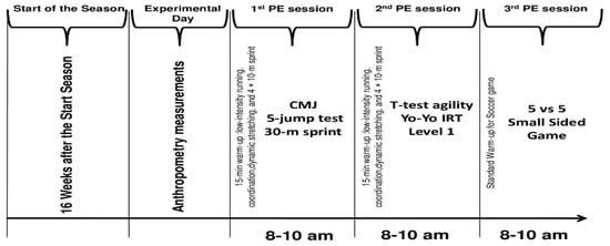 This study had a cross-sectional design. The investigation took place during the 2021–2022 school mid-season (16 weeks after the beginning of the season). Before beginning the experimental testing, anthropometric measurements were taken. In the experimental days, testing was performed during 3 consecutive physical education sessions (during regular physical education sessions). Across the three testing sessions, all participants performed a standardized 15 min warm-up that consisted of low-intensity running, coordination movements and dynamic stretching (i.e., high knee lifts, butt kicks, straight-line skipping, etc.) and 4 × 10 m sprint. On the first session, participants performed a CMJ, a 5-jump test (5JT), and a 30 m sprint. During the second session, participants performed the t-test for agility and a Yo-Yo IRT Level 1. On the third session, in addition to the standardized warm-up, the girls do simple technical tasks with the soccer ball, and they performed a 5 vs. 5 SSG with four supporting players and without goalkeeper (Figure 1). In order to determine the impact of teacher verbal encouragement on the performance of girls during the physical, technical and physiological tests in this study, we chose these test measures [YYIRT1, CMJ; 5JT, t-test, sprint speed (30 m); technical skill; and HR responses during SSG)] and not others. These tests are easy to perform in practice and do not require a lot of materials. Moreover, the participants were familiarized and accustomed to these tests. In each testing protocol, the verbal encouragement group performed the SSG with teacher’s verbal encouragement, and the contrast group performed the SSG without verbal encouragement. Among the verbal encouragement group, the physical education teacher encourages the students using specific instruction (i.e., “Go, go, go,” “Well done,” “Again, again,” “Go, great courage,” “Go ahead, try again,” “Come on, you will get there,” “Trust yourself, and you can”) [22]. All assessments were conducted on the same synthetic pitch grass to limit the effects of circadian variations on the measured variables. The tests were performed on the same synthetic pitch and at the same hours (8:00–10:00) to avoid any potential diurnal variation of performance. All test procedures were supervised by the same assessors, and all students’ girls were familiarized with all test procedures. In the school, the sports field is very wide, and the two groups work separately. When the teacher encourages the experimental group, the contrast group does not listen to the teacher’s intervention.