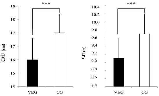 The CMJ and 5JT performance indices were displayed in Figure 2. The results show that those of the VEG were significantly higher than those of the CG (p < 0.001) with large marginal of change (CMJ: ES = 1.09; 5JT: ES = 1.15).