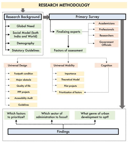 The research background consists of an understanding of topics such as the global need for universal mobility, the social model of disability, demographic studies, and statutory guidelines, all of which have been discussed in Section 1–Part a, b, and c. The primary survey involves the survey of 257 experts from 21 states and 1 union territory in India. The findings of the primary survey are elaborated on in Section 2.2.1, Section 2.2.2, Section 2.2.3, Section 2.2.4, Section 2.2.5, Section 2.2.6, Section 2.2.7, Section 2.2.8, Section 2.2.9, Section 2.2.10 and Section 2.2.11.