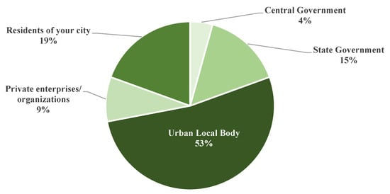 A total of 135 respondents felt that the major obstacle in the implementation of universal design in their city is an urban local body. Following this, 50 respondents blamed residents, 39 respondents accused the state government, 22 respondents attributed private enterprises/ organizations, and 11 respondents thought the central government were the major obstacle in the implementation of universal design in their city. Figure 4 shows the percentage share of each category of respondents.