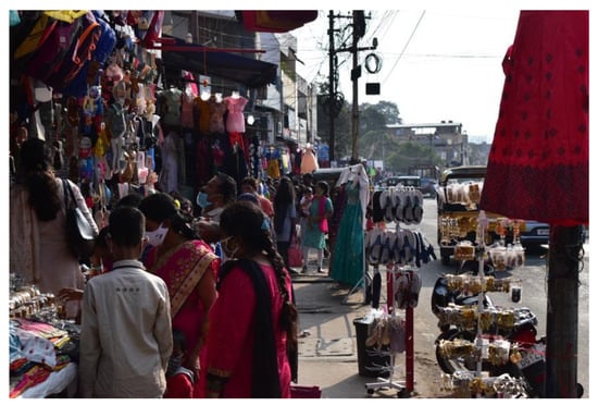 Aligned with the findings for this research, other research on universal mobility done by the author for the past decade also reflects the critical condition of footpaths in urban India, especially in old cities [,,,,]. Figure 9 and Figure 10 show some footpath conditions in various cities in India.